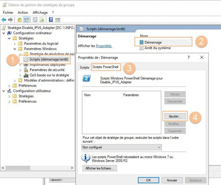 - Configuration Ordinateur > Paramètres Windows > Scripts (Démarrage/arrêt) > Démarrage