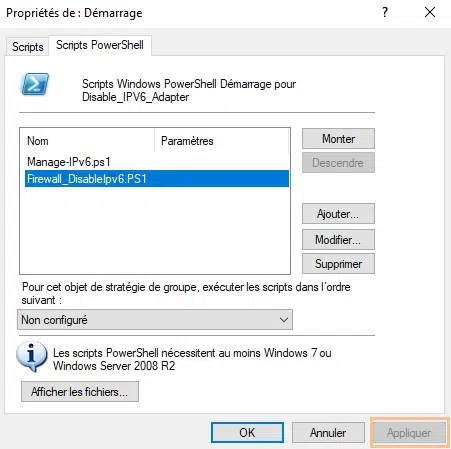 Cliquez ensuite sur « Appliquer » puis « OK » pour fermer la fenêtre de la GPO. Vérifiez bien que 2 scripts sont liés à la GPO. L’ordre n’a pas d’importance.