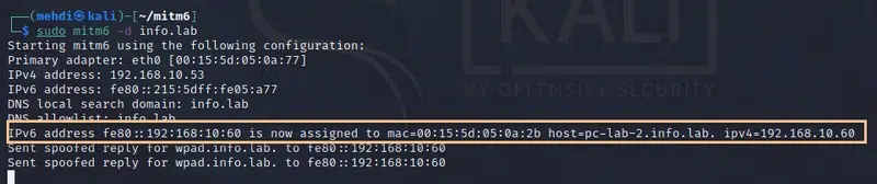 Dans notre laboratoire, nous avons utilisé une machine Kali Linux pour jouer le rôle de l’attaquant. Avec l'outil mitm6, nous pouvons envoyer des configurations DNS aux machines IPv6 sans qu'elles soient correctement configurées. Ensuite, nous avons observé les échanges à partir d'un fichier de configuration WPAD pour illustrer la possibilité d'une attaque NTLM relay.