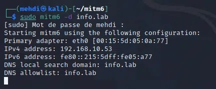 Une fois l'installation terminée, nous lancerons l'outil pour qu'il commence à écouter les demandes IPv6 sur le réseau. L'outil enverra régulièrement des requêtes ping pour détecter de nouvelles machines. Lorsqu'une machine est capturée, l'outil lui attribuera une fausse adresse IPv6 et un faux DNS afin d'intercepter les échanges.
