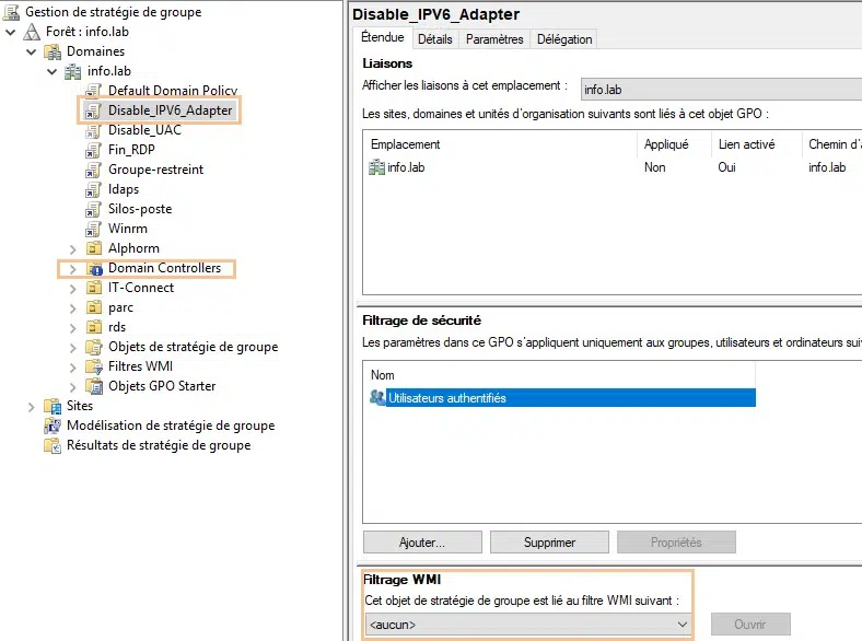 Notre GPO est alors créée ! Au prochain redémarrage des serveurs et des machines, le protocole IPV6 sur les cartes sera bloqué.