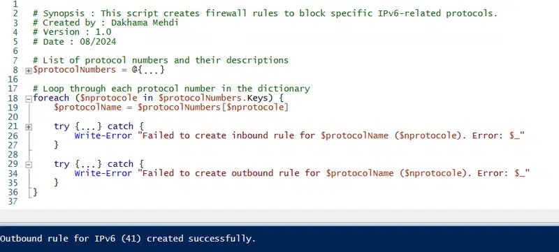 Le script « Firewall_DisableIpv6.PS1 » permet de créer des règles de pare-feu pour les connexions entrantes et sortantes, bloquant ainsi tous les protocoles IPV6. Comme mentionné ci-dessous.