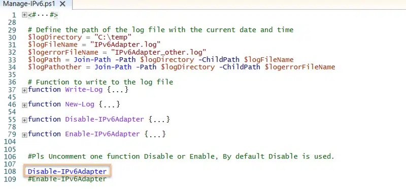 Le script est composé de deux fonctions majeures, « Enable-IPv6Adapter » et « Disable-IPv6Adapter », l'une permet d'activer la prise en charge IPv6 sur toutes les cartes locales et l'autre de désactiver le protocole, c'est cette dernière qui est activée par défaut.