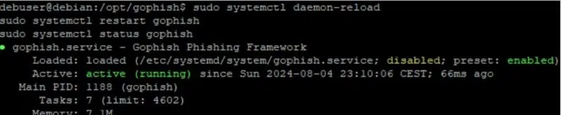 Loaded: loaded (/etc/systemd/system/gophish.service; enabled; preset: enabled)