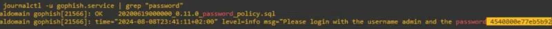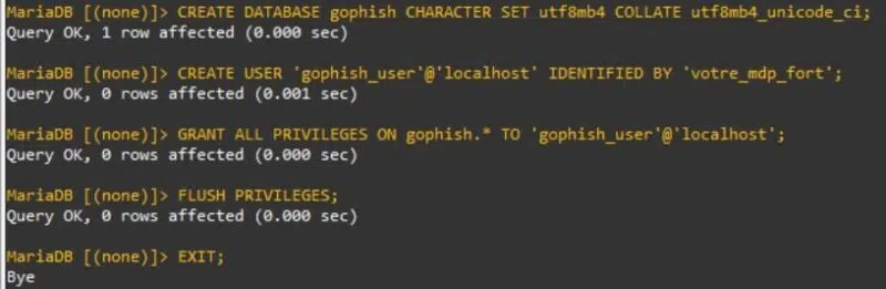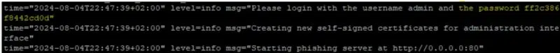Explications : la première commande rend le fichier Gophish exécutable. Les deux autres commandes naviguent dans le répertoire de Gophish et lancent l'application pour la première fois, ce qui génère le mot de passe administrateur.