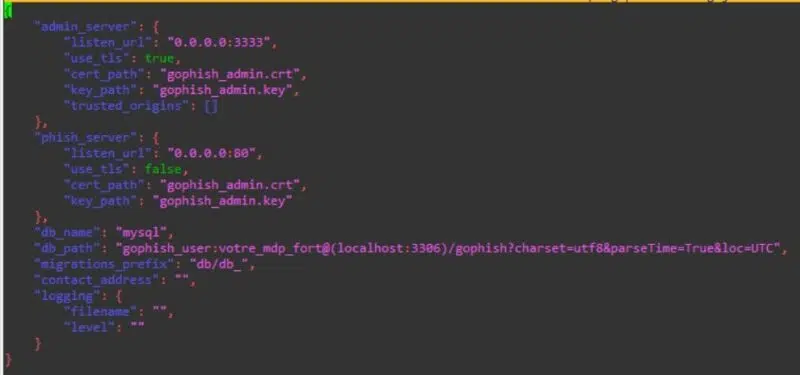 Ce fichier de configuration définit les paramètres de Gophish, y compris les adresses et les ports sur lesquels les serveurs administratifs et de phishing vont écouter, les chemins des certificats TLS, et les paramètres de la base de données.