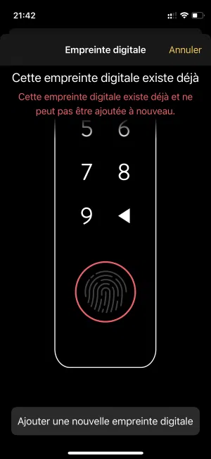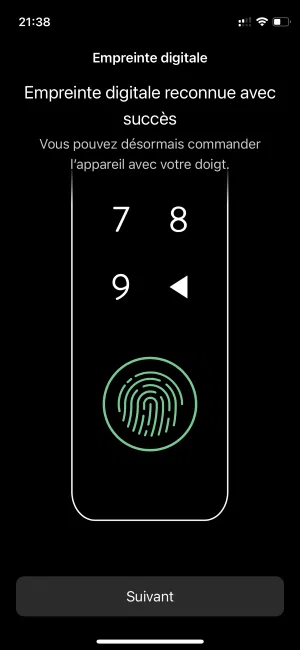 Vous pouvez enregistrer un total de 20 empreintes en plus des 200 codes et il est tout à fait possible d’enregistrer différentes empreintes pour chaque utilisateur (les index qui sont les plus utilisées, mais aussi les pouces sans difficulté). Comme pour les smartphones, l’application vous demande de positionner le doigt à plusieurs reprises afin de prendre en compte le maximum de détails.