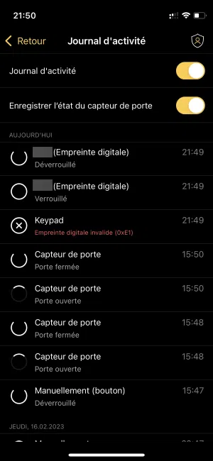 Comme avec la version 1, tous les évènements générés par le Keypad sont enregistrés dans le journal de l’application avec tous les détails nécessaires. Vous retrouvez l’identifiant des personnes, le type de connexion (codes ou empreintes), date et heure de l’évènement et l’état de serrure (verrouillé/déverrouillé).