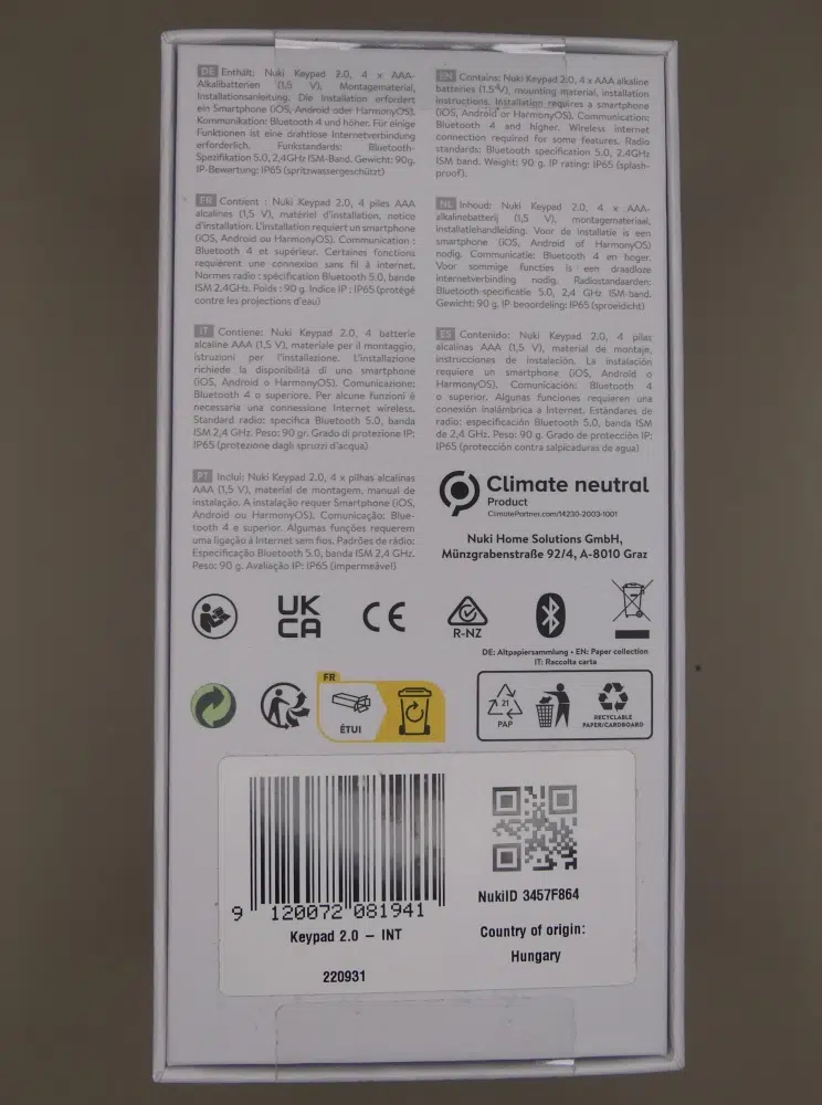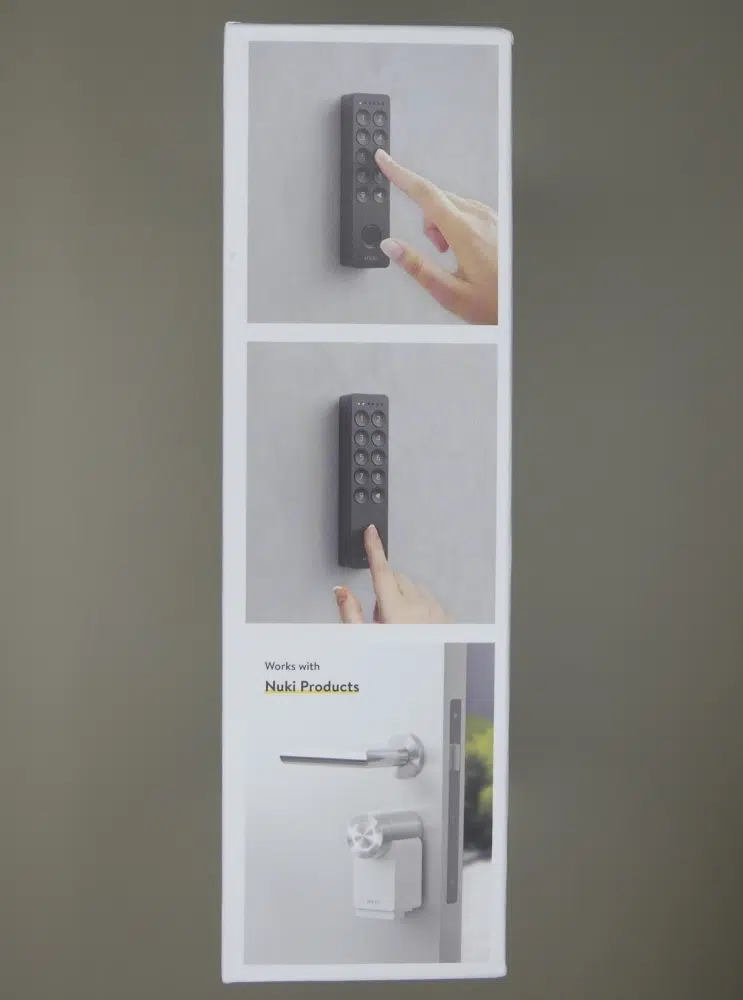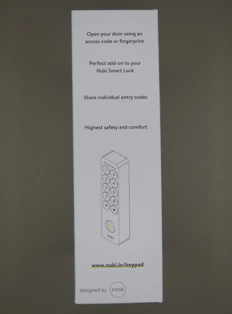 Pour contenir ce nouveau Keypad 2.0, Nuki a fait évoluer son emballage. En effet, contrairement au package de la première version qui (pour moi) ressemblait plus à un emballage d’accessoires (peut-être parce que je l’ai reçu dans un set, ne vous méprenez pas le V1 était quand même bien protégé), ce nouvel emballage reprend les codes du fabricant autant pour sa qualité, sa robustesse que par son design. Vous retrouvez un maximum d’informations comme pour les Smartlock.