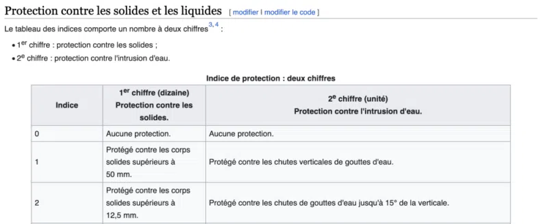 IP 65 : totalement protégé contre les poussières. Protégé contre les jets d'eau de toutes directions à la lance (buse de 6,3 mm, distance 2,5 à 3 m, débit 12,5 l/min ±5 %).