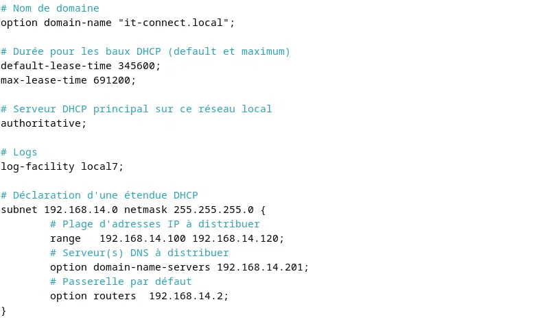 Dans ce fichier, vous pouvez déclarer des options au niveau du serveur ou au niveau de chaque étendue, selon vos besoins. Cela signifie qu'une option peut être positionnée au sein d'un bloc déclaratif "subnet" pour être appliquée à une étendue, ou en dehors, pour s'appliquer par défaut sur toutes les étendues.