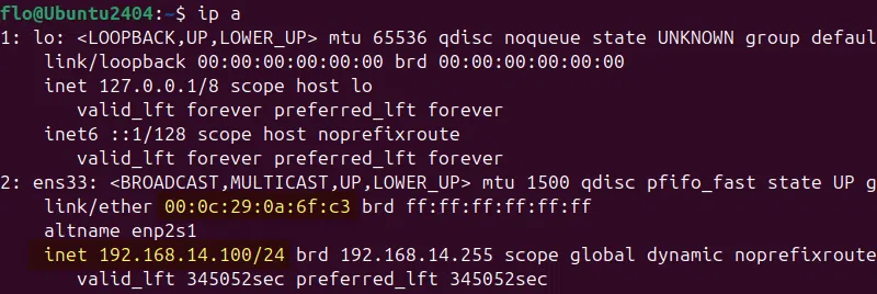 déc. 03 10:09:50 srv-dhcp-1 dhcpd[3540]: DHCPACK on 192.168.14.100 to 00:0c:29:0a:6f:c3 (Ubuntu2404) via ens33