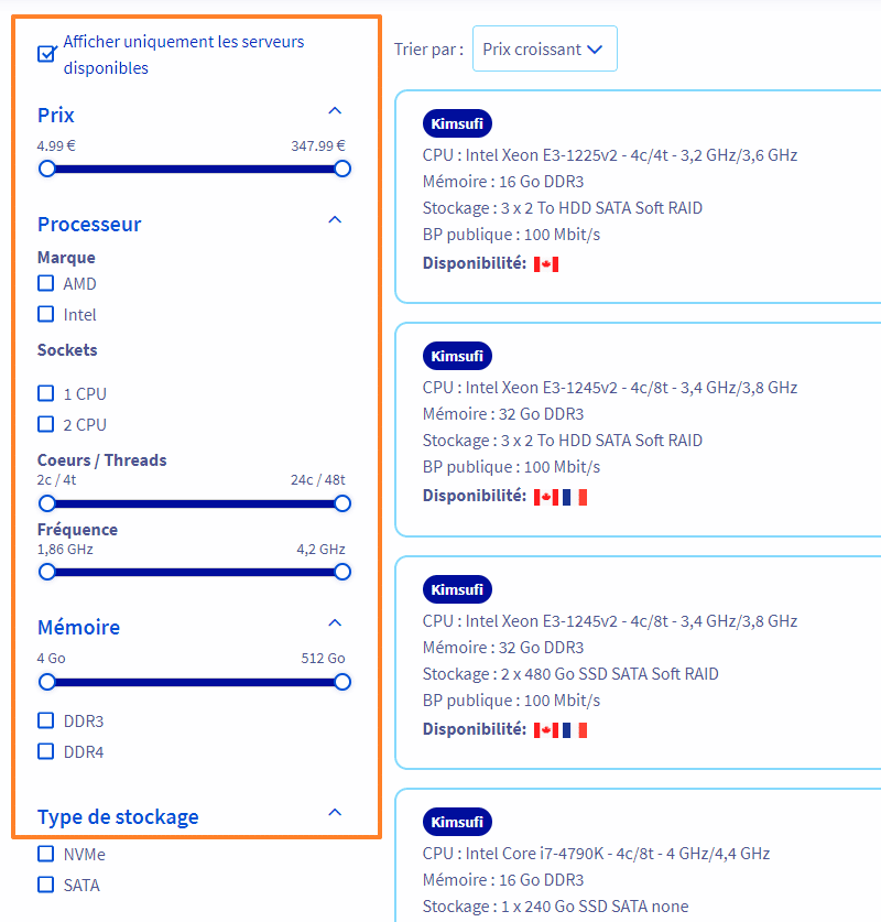 La colonne latérale située à gauche regroupe différents filtres afin de vous permettre d'identifier le serveur qui correspond le mieux à vos besoins. : marque du processeur, nombre de processeur, budget mensuel, quantité de RAM, type de disque, etc... Très pratique, ce système de filtres n'était pas disponible sur les interfaces de Kimsufi et So You Start. La recherche d'un serveur est simplifiée, car les différentes gammes sont regroupées sur une seule interface donc il n'est plus nécessaire de passer d'un site à l'autre pour comparer les serveurs.