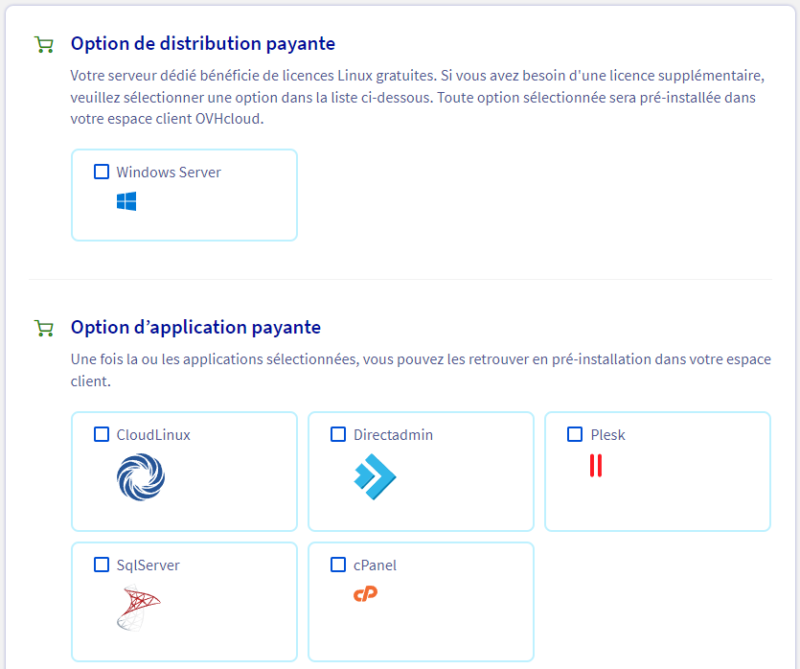 Lorsque l'on commande l'un de ces serveurs, il y a quelques options de personnalisation. Concrètement, on peut sélectionner la région que l'on souhaite (France, Canada, Allemagne, etc...) ainsi qu'une application en option (CloudLinux, Plesk, SQLServer, cPanel, etc...). Avec les gammes Rise et So You Start, on peut aussi prendre une option pour avoir une licence Windows Server 2019 ou Windows Server 2016. Néanmoins, il n'est pas possible de personnaliser le stockage (par exemple : remplacer les disques SATA par des disques NVMe), car cette possibilité est réservée aux serveurs dédiés OVHcloud, notamment les serveurs de la gamme Advance.