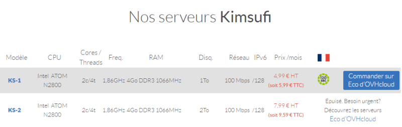 Économique parce qu'OVHcloud cherche à proposer un rapport qualité/prix imbattable sur le marché avec sa gamme de serveurs dédiés Eco pour rendre le Cloud accessible à tous, et au bon prix. Historiquement, la marque Kimsufi est la plus abordable et cela ne change pas : pour 4,99€ HT par mois, vous pouvez louer un serveur dédié avec processeur Intel Atom N2800 (2 cœurs), 4 Go de RAM, un disque dur de 1 To et une connectivité réseau à 100 Mbps.