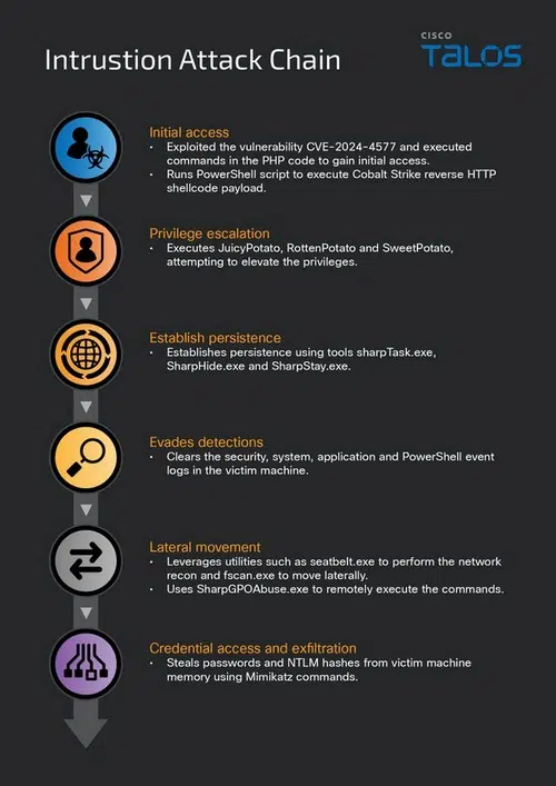 "L'attaquant utilise des plugins du kit Cobalt Strike "TaoWu", disponible publiquement, pour des activités d'exploitation a posteriori.", peut-on lire dans le rapport. Le schéma ci-dessous illustre la chaine d'exploitation identifiée par Cisco Talos.