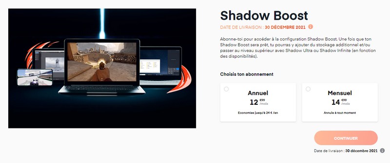 Pour le moment, sur le site de Shadow on peut s'abonner à l'offre Shadow Boost mais la date de livraison est estimée à décembre 2021.