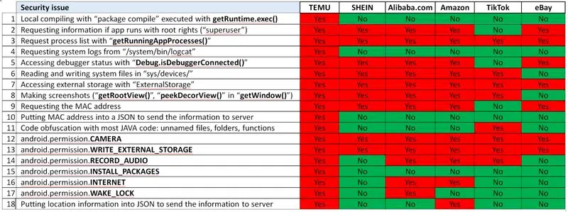 Pour fonctionner, l'application Temu a besoin de nombreuses autorisations, et c'est même suspect / anormal, pour une application de ce type : enregistrer des audios, accéder à la caméra, installer des paquets, ou encore écrire sur l'espace de stockage. Le tableau ci-dessous est particulièrement évocateur : "Nos experts ont identifié une série de fonctions logicielles totalement inappropriées et dangereuses pour ce type de logiciel. TEMU les utilise toutes."