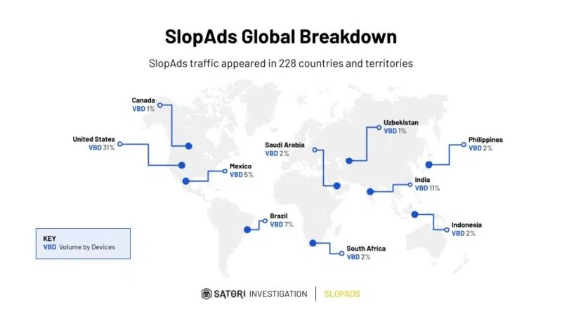 D'après le rapport de HUMAN, l'opération SlopAds a une envergure internationale, avec des téléchargements enregistrés dans 228 pays. Les pays où l'activité a été la plus forte sont les États-Unis (31 %), l'Inde (11 %) et le Brésil (7 %). L'infrastructure des pirates reposait sur de nombreux serveurs C2 et plus de 300 noms de domaine.