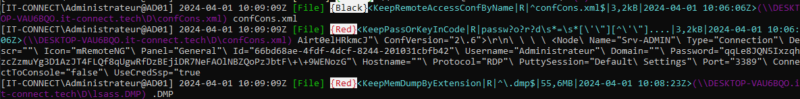 - La première ligne nous indique qu'une règle de détection a trouvé un fichier intéressant (d'après son nom) : "confCons.xml". Les connaisseurs reconnaitront le nom d'un fichier de configuration de l'outil "mRemoteNG", utilisé pour stocker les connexions (nom, login, mot de passe) des connexions RDP, SSH, etc.