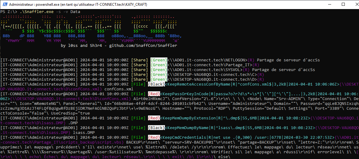 .\Snaffler.exe -s -v Data -n AD01.it-connect.tech,DESKTOP-VAU6BQO.it-connect.tech