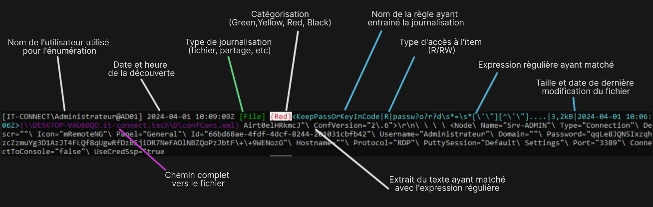 Pour mieux comprendre encore, voici la structure de chaque ligne de sortie Snaffler (cliquez sur l'image pour zoomer) :