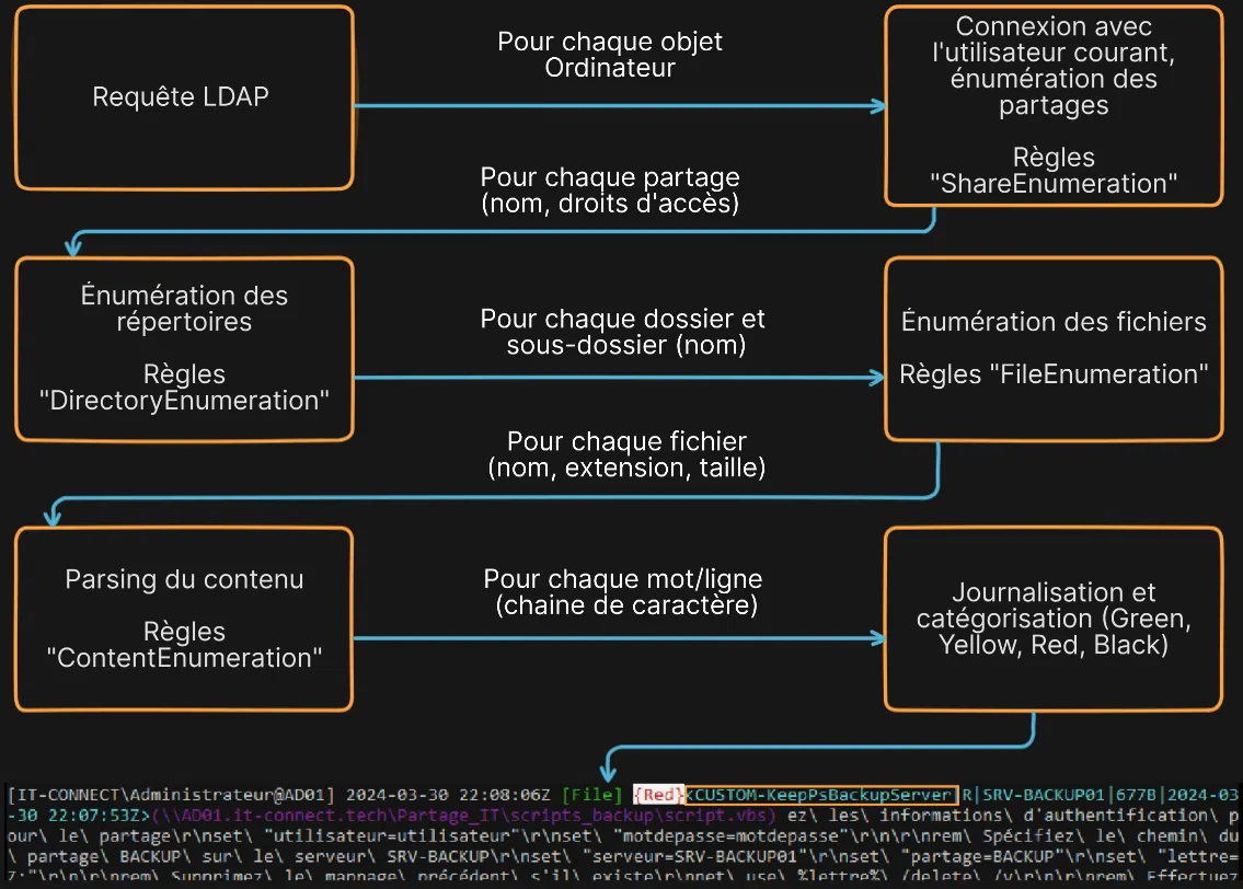 Pour mieux comprendre le fonctionnement de Snaffler, il faut savoir que celui-ci effectue une recherche et catégorisation progressive des fichiers et informations en fonctions des règles fournies. D'abord, il va rechercher les fichiers dans tous les partages, dossiers et sous-dossiers sur lequel il dispose de droits de lecture. Un premier tri est effectué sur ces fichiers :