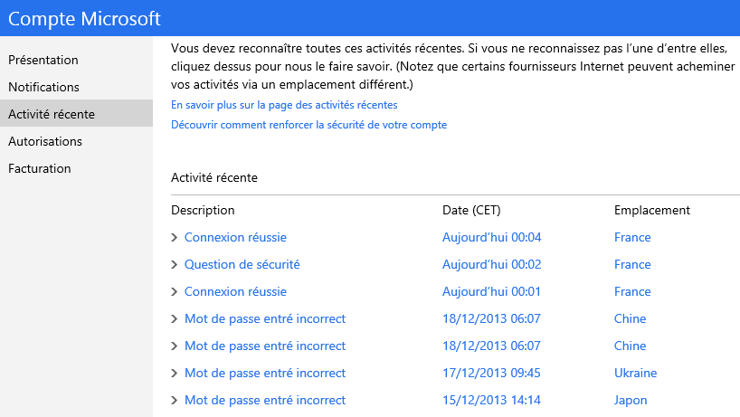Afin de voir ma propre actualité récente, j'ai pu remarqué que des tentatives de connexion à mon compte Microsoft ont été effectuée depuis la Chine, l'Ukraine ou encore le Japon.