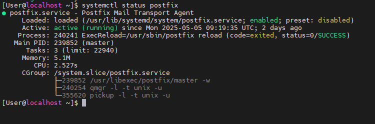 Vérifiez que le service Postfix est bien démarré, vous devriez avoir un résultat semblable à celui-ci :