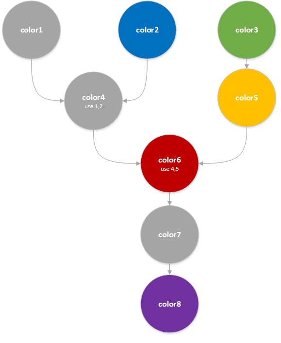 - Color6 prend l’hérite de color4 et 5 avec une priorité sur color4. Color4 est de couleur bleue par héritage donc il aurait pu hériter la couleur bleue à color6 si il n’avait pas déjà la couleur rouge. Color6 bloque donc l’héritage de 4 et 5 et reste rouge.