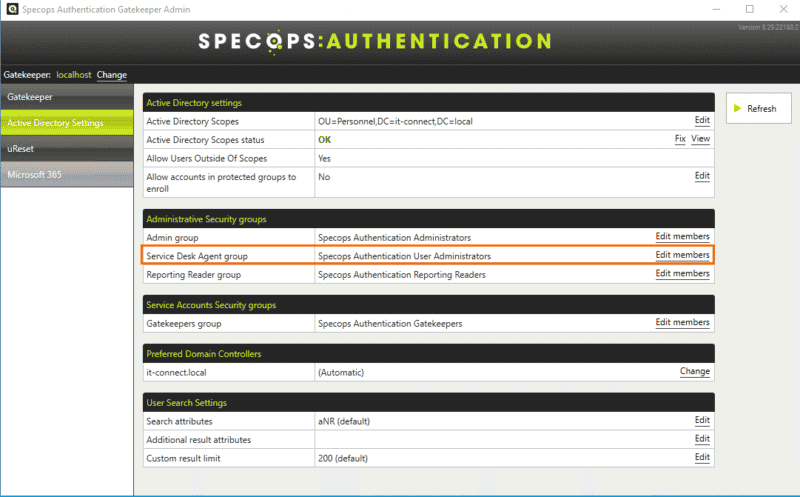 Pour l'utilisation de Secure Service Desk (SSD), la section "Active Directory Settings" sera particulièrement intéressante. Le reste de la configuration s'effectue en ligne à partir du portail Specops. Durant l'installation, un compte gMSA est mis en place pour l'exécution du service.