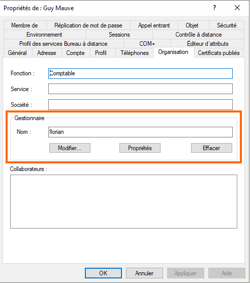 Secure Service Desk offre la possibilité de solliciter le responsable de cette personne, selon la configuration définie dans l'Active Directory. Dans l'exemple ci-dessous, l'utilisateur "florian" est défini comme étant le gestionnaire de "Guy Mauve".