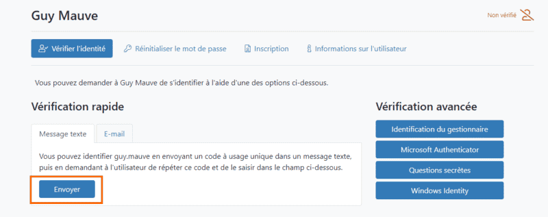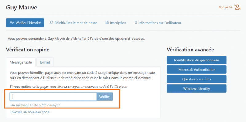 Plusieurs méthodes de vérification sont disponibles, notamment la vérification par SMS que je prends ici comme exemple. En cliquant sur "Envoyer" sous "Message texte", cela va envoyer un code par SMS à l'utilisateur. Comment Secure Service Desk parvient-il à récupérer le numéro de téléphone ? Simplement à partir de l'Active Directory donc cela implique que la fiche de l'utilisateur soit correctement renseignée.