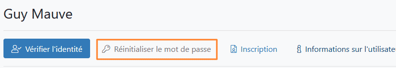 Ensuite, en basculant sur l'onglet "Réinitialiser le mot de passe", on va pouvoir changer le mot de passe de l'utilisateur Guy Mauve et lui communiquer par e-mail ou SMS. Il devra, ou non, le modifier à la prochaine ouverture de session selon l'option "<utilisateur> doit changer de mot de passe à sa prochaine connexion" (il est possible de préconfigurer et verrouiller cette option dans les paramètres de SSD).