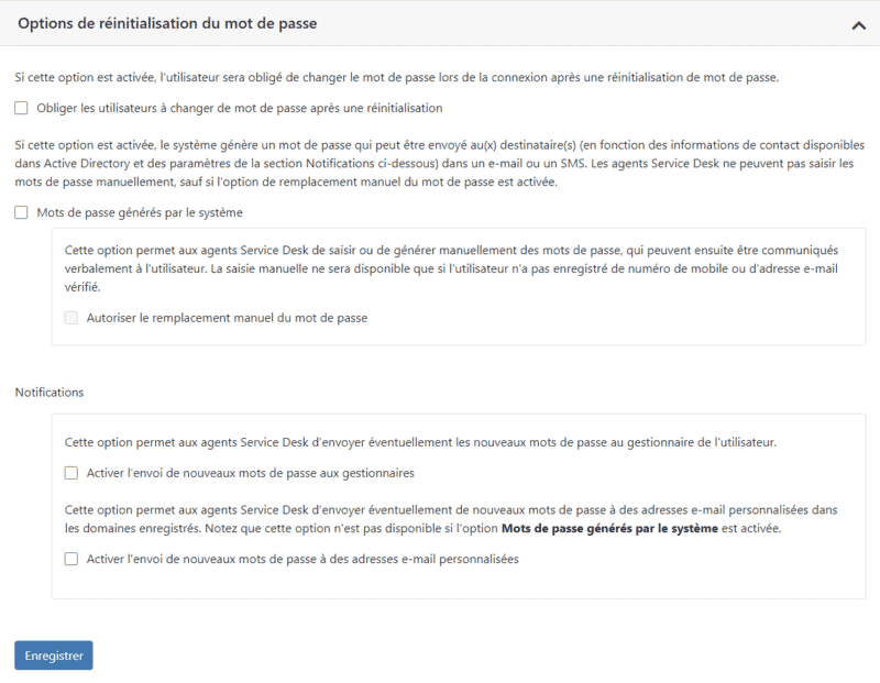 Specops Secure Service Desk offre des options pour personnaliser les SMS et e-mails, mais également ajuster les options de notifications et réinitialisation du mot de passe comme le montre l'exemple ci-dessous.