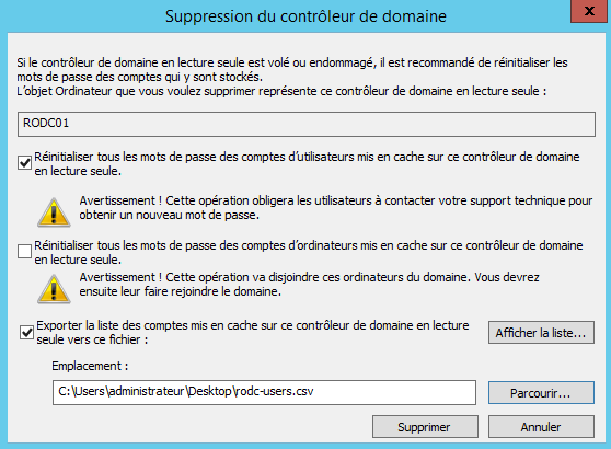 Fermez cette fenêtre une fois la liste visualisée. Cliquez sur « Supprimer » pour valider la suppression du RODC.