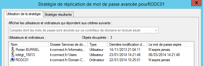 Si vous cliquez sur « Afficher la liste » vous verrez quels sont les comptes mis en cache sur le RODC sélectionné, de quoi vous donner un ordre d’idée de l’importance des dégâts suite à un éventuel vol.