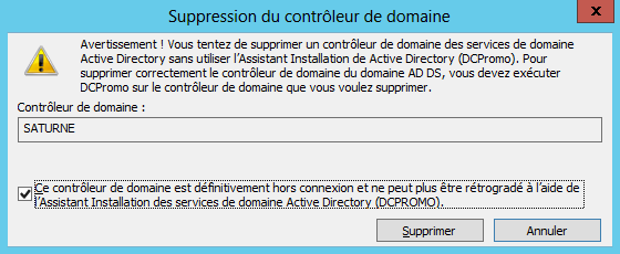 Cliquez sur "Oui" puis un second message apparaîtra. Cochez la case puisque ce contrôleur de domaine est définitivement hors connexion et que l'on ne peut pas le rétrograder à l'aide de DCPROMO. Ensuite, cliquez sur "Supprimer".