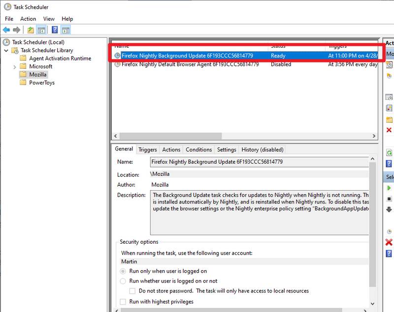 D'après Nick Alexander, un ingénieur de chez Mozilla, le profil par défaut de Firefox va créer une tâche planifiée sur le système. Cette tâche sera associée au compte utilisateur courant. Google et Edge s'appuient déjà sur un mécanisme de tâches planifiées pour effectuer des mises à jour automatiques, à la différence que la tâche est associée au compte système.