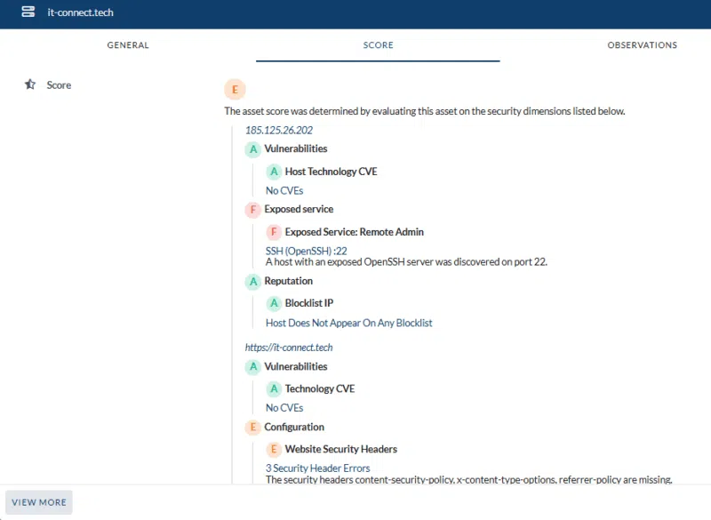 L'image précédente met en évidence un score "E" pour ce domaine, ce qui n'est pas un bon score. En accédant aux détails du domaine, il est possible d'obtenir des explications. Ici, nous apprenons notamment ceci :