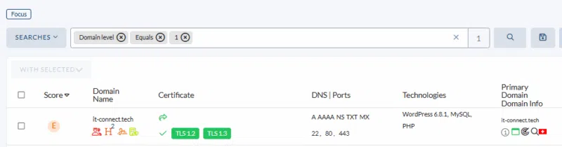 Cette découverte est automatisée et continue, avec une mise à jour régulière des résultats. Chaque domaine détecté est enrichi d’informations clés : type d’enregistrements DNS, date de détection, méthodes de découverte utilisées, adresse IP associée au domaine, registrar, technologies détectées, etc.