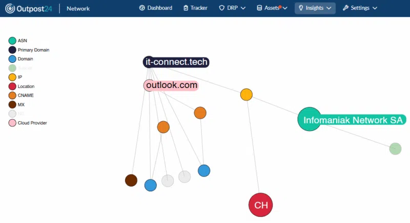 La fonctionnalité de cartographie du réseau génère un visuel des dépendances entre les actifs. Elle révèle les connexions parfois insoupçonnées entre systèmes internes et services tiers. Ici, nous pouvons facilement comprendre que le domaine it-connect.tech est rattaché à une adresse IP (point jaune) correspondante au fournisseur de service Infomaniak, et que cette adresse IP est localisée en Suisse.