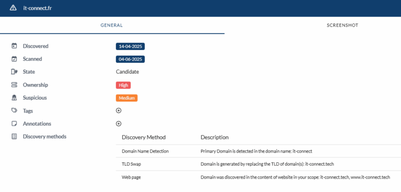 Par exemple, dans le cadre de l'analyse du domaine it-connect.tech, Sweepatic considère le domaine it-connect.fr comme ayant de fortes chances d'avoir le même propriétaire. Il le considère aussi comme suspect, car il reprend le même nom : la seule différence étant située au niveau de l'extension (.fr au lieu de .tech). Dans le cas où je décide d'ajouter ce domaine à mon périmètre d'analyse, Sweepatic va poursuivre la découverte avec les assets associés à ce domaine. Il en va de même pour it-connect.com sauf que ce dernier ne m'appartient pas : il pourrait donc être intéressant de le surveiller.