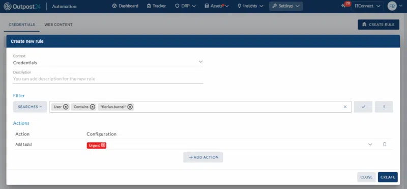 Par exemple, vous pouvez ajouter le tag Urgent sur un événement si ce dernier concerne la fuite d'identifiants dont le nom de l'utilisateur contient la chaine florian.burnel. Il est également possible d'envoyer une alerte par e-mail ou sur un système de communications comme Teams. Autre possibilité : déclencher un Webhook.