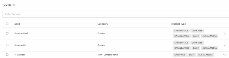 Pour que la surveillance soit complète et efficace, vous devez créer des "Seeds", qui sont comme des mots-clés à rechercher. Ceci permet de contextualiser la surveillance pour qu'elle soit adaptée à votre organisation. Il peut s'agir d'un nom de domaine (site web, messagerie, etc.), du nom de l'entreprise ou d'un produit, etc.