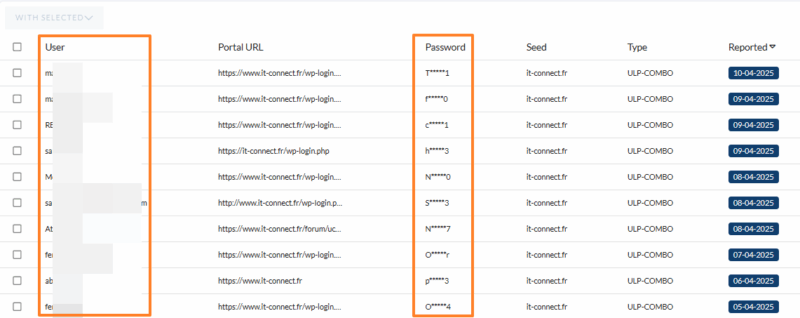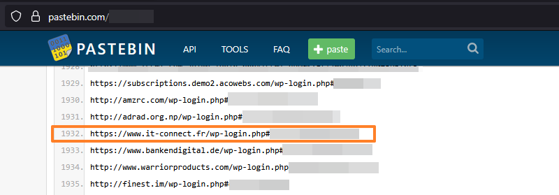 Ce Paste de plusieurs milliers de lignes contient des liens vers des pages de connexion WordPress, avec à chaque fois, un identifiant et un mot de passe. Il y a une occurrence faisant référence à IT-Connect avec un compte déjà détecté par le module de Threat Intelligence évoqué précédemment.