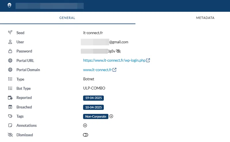 En cliquant sur un élément, il est possible d'obtenir des détails, notamment la date à laquelle l'élément a été compromis, ainsi que sa provenance. Sachez que la solution Sweepatic analyse les places de marchés du Dark Web et certains canaux Telegram pour détecter la présence d'identifiants correspondant à votre organisation.