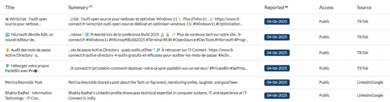 L’IA est également intégrée aux modules de Threat Intelligence pour générer automatiquement des résumés de contenu. Sur les réseaux sociaux, elle synthétise les publications, tandis qu'elle résume en une phrase le contenu des pages détectées sur le Dark Web. Cela permet de gagner un temps du temps, en mettant en évidence les informations les plus pertinentes, ce qui permet de faire du tri plus rapidement.