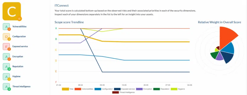 Les scores, notés de A (excellent) à F (critique), sont pondérés pour calculer une note globale. Quotidiennement, Sweepatic effectue un scan intelligent des ports les plus exposés (Top 100) pour détecter toute évolution, tel qu'un nouveau port ouvert sur un hôte. Du point de vue du système analysé, cette analyse est non intrusive, mais suffisamment complète pour offrir une visibilité précise. Enfin, chaque score est mis en perspective avec une note moyenne sectorielle, calculée à partir des données réelles des clients Sweepatic et des références du marché.