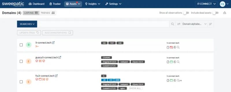 Chaque domaine surveillé sera ajouté à votre liste d'assets de type "Domaine" et Sweepatic va analyser chaque domaine et ses sous-domaines afin de rechercher des services. Ceci permettra d'effectuer une analyse poussée sur chaque asset. Cette analyse sera effectuée à plusieurs niveaux : noms de domaine, sites web, certificats et hôtes.